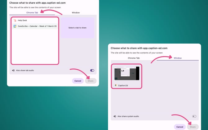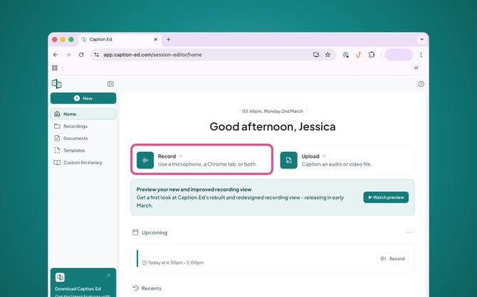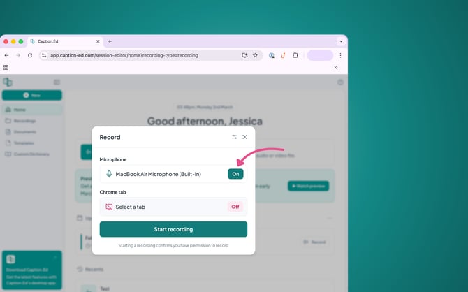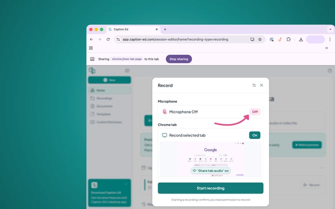 You can record browser tabs directly in the web version of Caption.Ed, perfect for transcribing YouTube videos, training content, or old meeting recordings. If it plays in a browser tab, Caption.Ed can transcribe it!