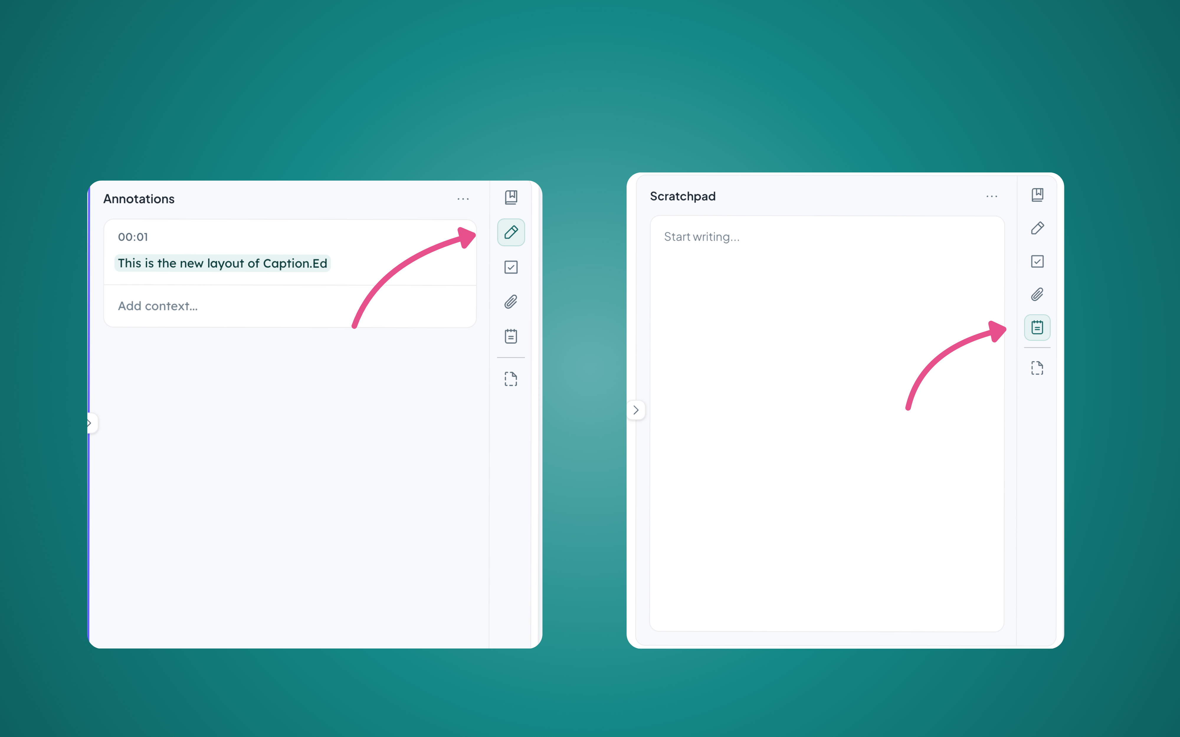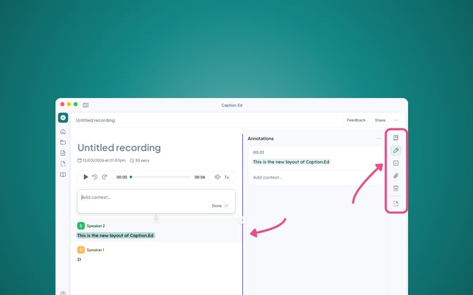 Previously, the workspace displayed three columns. Now, you have your transcript alongside a sidebar. If you preferred the old layout, you can keep the sidebar open, but you also have the option to hide it so you can focus solely on the captions. Both panels are resizable, giving you more flexibility to adjust the workspace to suit your needs.