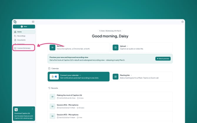 You can add these words, phrases, and acronyms to your custom dictionary, helping Caption.Ed recognise them easily and produce clearer, more accurate transcripts.