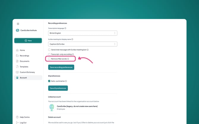 Under Recording Preferences, you'll be able to find "Remove filler words", tick this box, and then click the green "Save Recording Preferences" button.