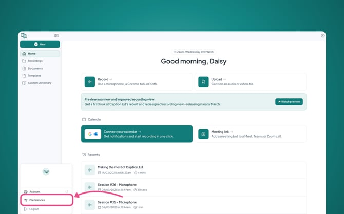 To customise your theme and transcript font, you will need to go to your Caption.Ed preferences. You’ll find this by clicking your name at the bottom left-hand corner.