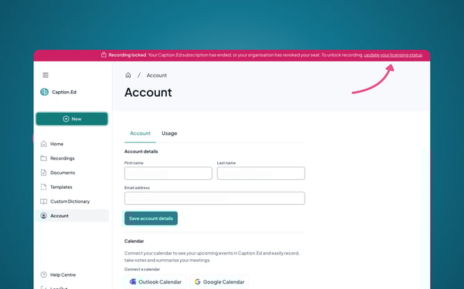 Once your subscription has expired, you can make changes to your account within Caption.Ed. You will find a red banner within the Caption.Ed app prompting you to update your licensing status.