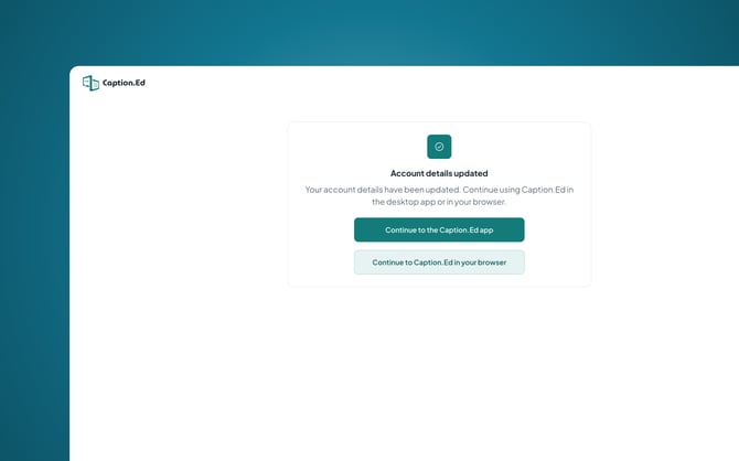 That is it! You’ll receive confirmation that your account details have been updated, and you’ll be able to continue through to Caption.Ed in the browser or desktop app.