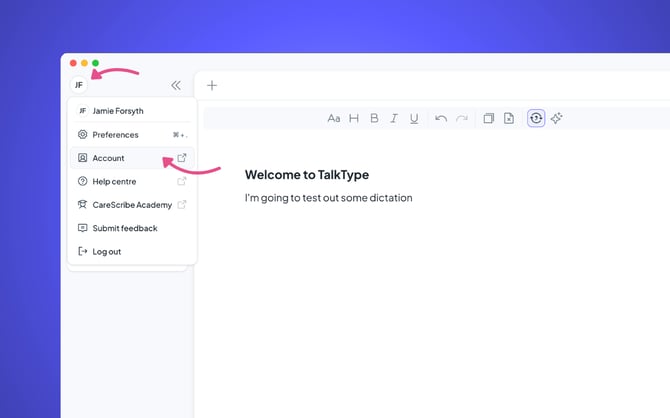 To update your subscription payment details for your TalkType license, log into TalkType, and then click on your initials in the top left-hand corner. This will open a drop-down, you will need to click “Account”