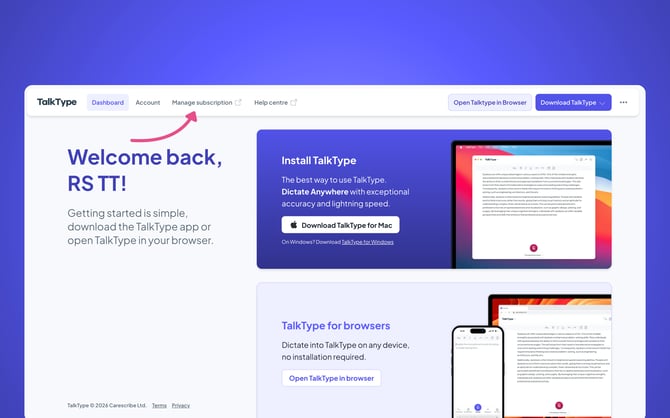 This will take you into your TalkType dashboard, here click on “Manage subscription”