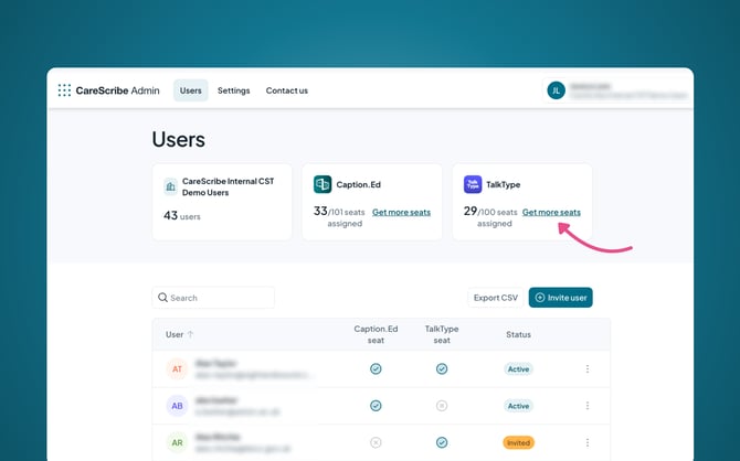 If you are interested in adding or purchasing new seats for either Caption.Ed or TalkType, clicking the ‘get more seats’ button will prompt you to message your Customer Success Manager, who will be in touch with you within two business days.