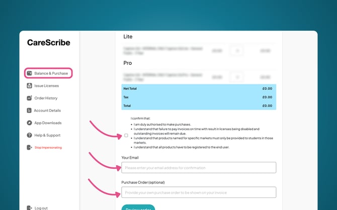 To buy and issue licenses, you will need to log into our reseller portal, and then go to your “Balance & Purchase” tab. Here you will find a list of available products.