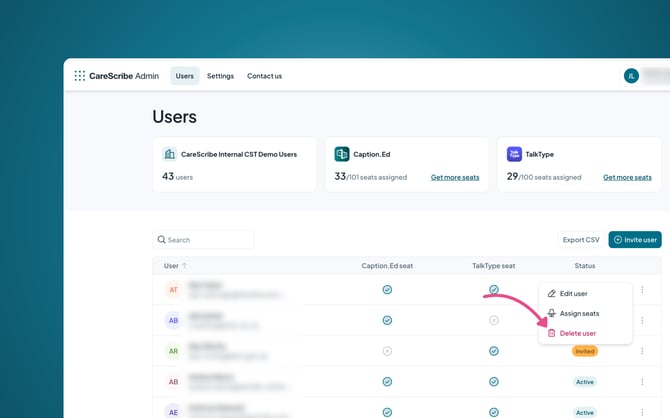 Within the CareScribe Admin dashboard you will find three dots at the end of each user, here you can: