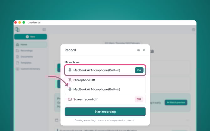 Next you will need to ensure that your microphone is enabled, you can click on your microphone to access alternative microphones for Caption.Ed to use.